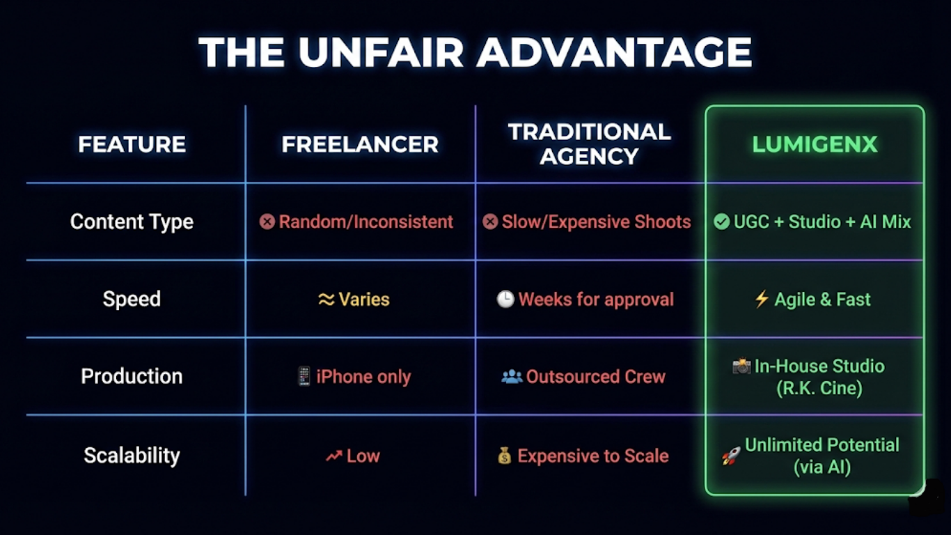 Get the perfect mix of Real Creators, Studio Quality, and AI Speed. Stop posting into the void. Start growing.