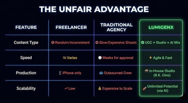 We combine Viral UGC Creators, Studio Product Shoots, and AI-Generated Content to build a brand presence that is impossible to ignore.